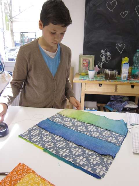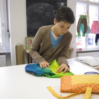 Learning by doing haben wir gedacht und Max gleich ins kalte Nähkurswasser geworfen. Bei Isabell konnte er nicht nur erleben, wie ein Nähkurs gestaltet wird, sondern hat auch gleich selbst ein Projekt realisiert. Mit allem drum und dran, versteht sich: Stoffauswahl, Zuschneiden, Teile aneinanderstecken und richtig zusammen nähen. Hier war Präzision gefragt und Max hat das perfekt gemeistert. Von wegen Mädchenkram, von unseren Computer-Nähmaschinen mit Displayanzeige und Musterprogrammierfunktionen sind auch Jungs schwer begeistert. Am Ende des Kurses hielt unser Max sein erstes selbstkreiertes Kissen in der Hand. Schönes Design, gut gemacht, lieber Max. Vielleicht machst du ja tatsächlich was mit Stoffen später….