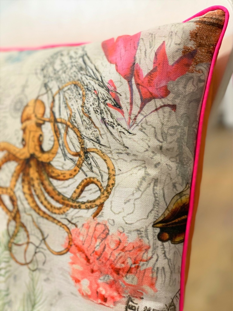 Jeder Stoff verleiht Deinem Kissen mit Hotelverschluss einen anderen Look. Wir haben uns für ein traumhaftes maritimes Design entschieden, eine wunderschöne Unterwasserwelt: „Baumwollstoff Nautilus allover Unterwasserwelt“.