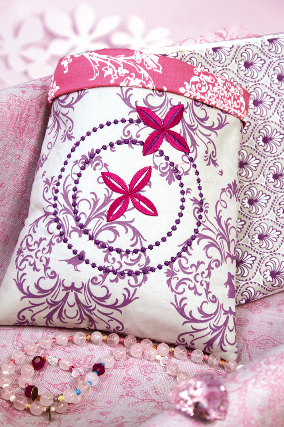 Wir haben einen sogenannten Candlewicking-Stich (Knötchenstich) gewählt, der z.B. im Zierstichrepertoire der PFAFF® expression™ oder ambition™ Computernähmaschinen enthalten ist. Im Kreis gestickt wirkt er plötzlich wie eine große Stickerei, die eigentlich nur eine Stickmaschine kann. Dank dem Zirkellineal kann das eine Nähmaschine auch. Traumhaft schön, findet ihr nicht? Und ihr ahnt schon, wie viele Möglichkeiten sich hier durch andere Stiche und die unterschiedlichen Kreisradien ergeben. Man kann ja auch nur halbe Kreise sticken und auf diese Weise neue Muster erzeugen. Und man kann sogar Kreise perfekt applizieren, das kann man in diesem Video sehr schön sehen.