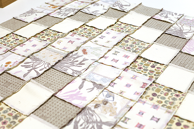 Die Anordnung der Quadrate, also das Muster der Patchworkdecke, ist der spannenste Schritt. Hier seht ihr schon, wie die Decke hinterher aussehen wird. Es darf probiert, geschoben und experimentiert werden. Die zugeschnittenen Stoffquadrate können entweder Querbeet angeordnet werden oder einem Muster folgen. Wir haben uns für die Wiederholung einer Reihenfolge entschieden und ordnen alle Quadrate versetzt um eine Reihe an. Dadurch entsteht eine Art Treppenmuster. Ein geordnetes Chaos sozusagen.